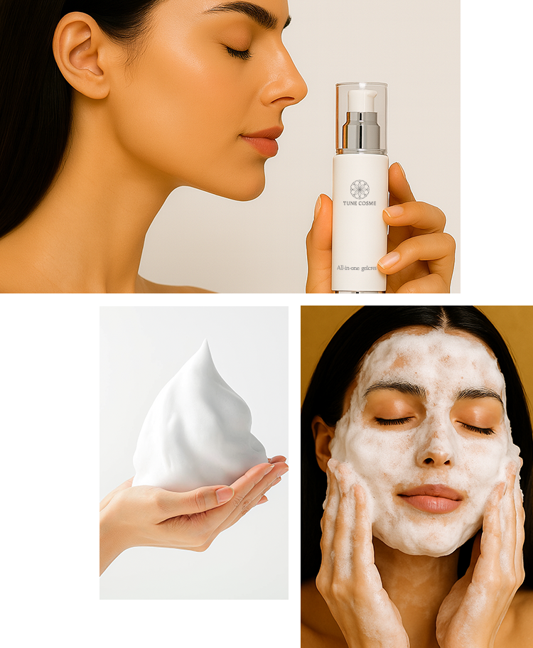 「TUNE COSME」は国内製造と厳選素材にこだわり、香りや装飾ではなく、本質を追求。肌と心に寄り添い、やさしさと実感を両立します。